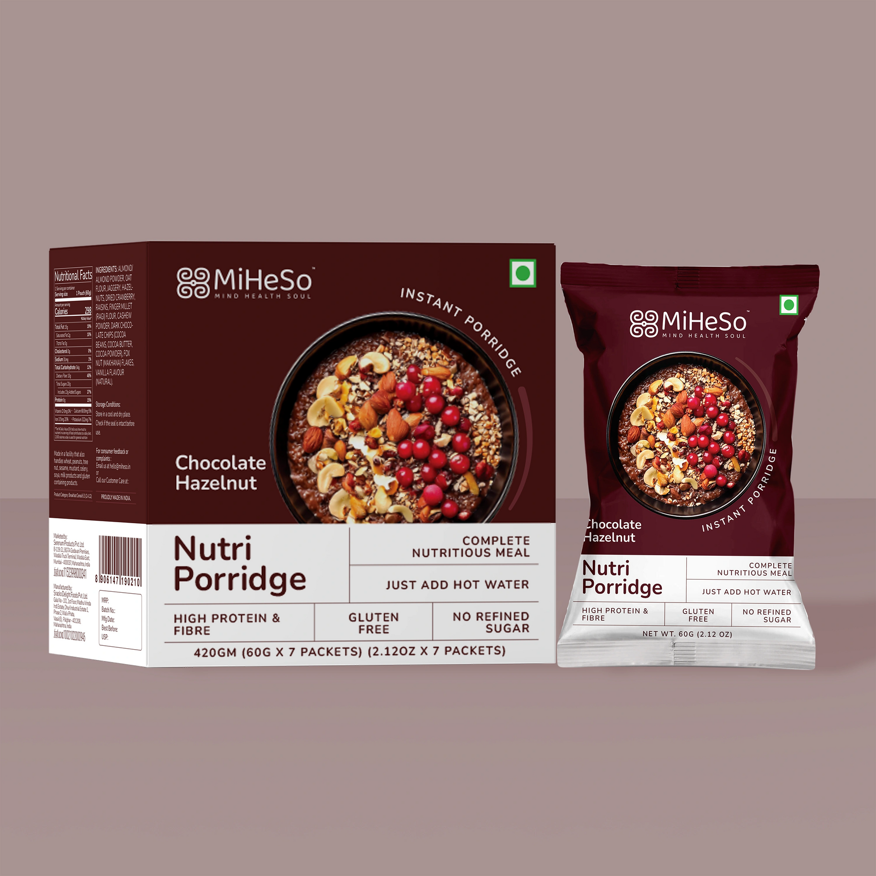 Enjoy your mornings with a delicious, nourishing twist. MiHeSo’s Chocolate Hazelnut Nutri Porridge blends premium cacao, hazelnuts, along with traditional, natural supergrains to deliver the perfect mix of protein, fiber, and taste. This gluten-free breakfast is designed for busy professionals who want to eat clean without compromising on indulgence. With no refined sugar and ready in minutes—just add hot water—it's the ideal go-to for weight-conscious foodies and wellness lovers.