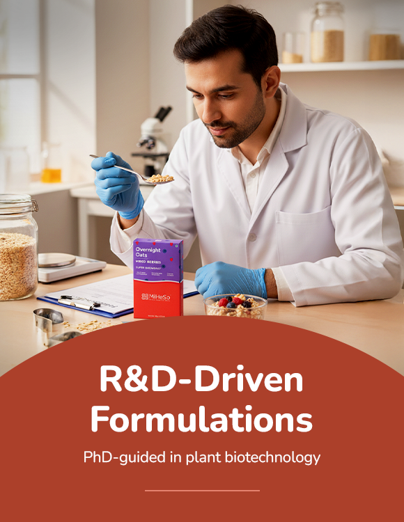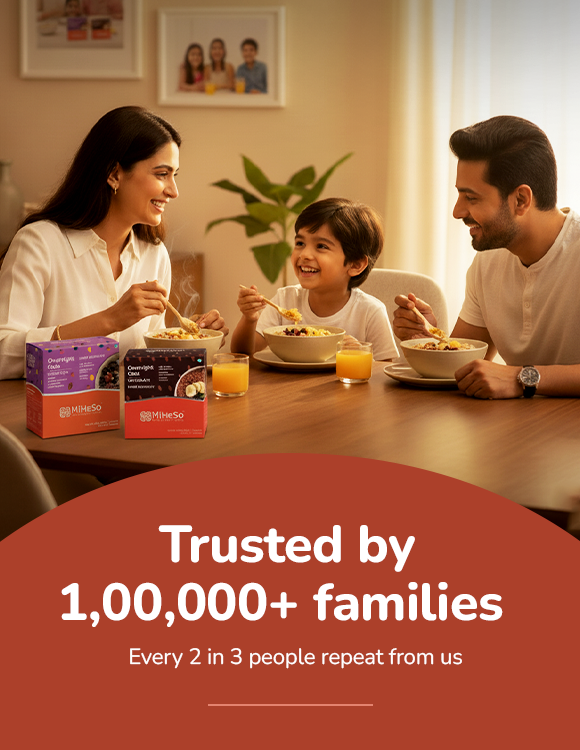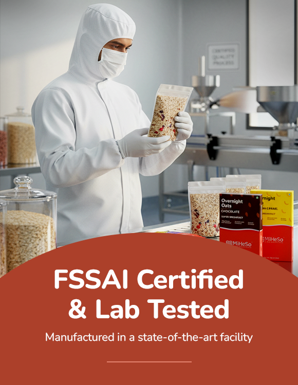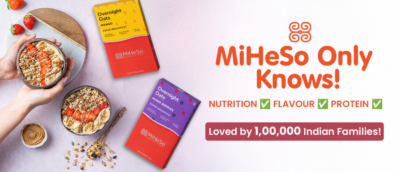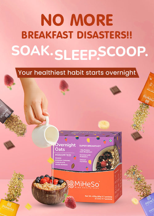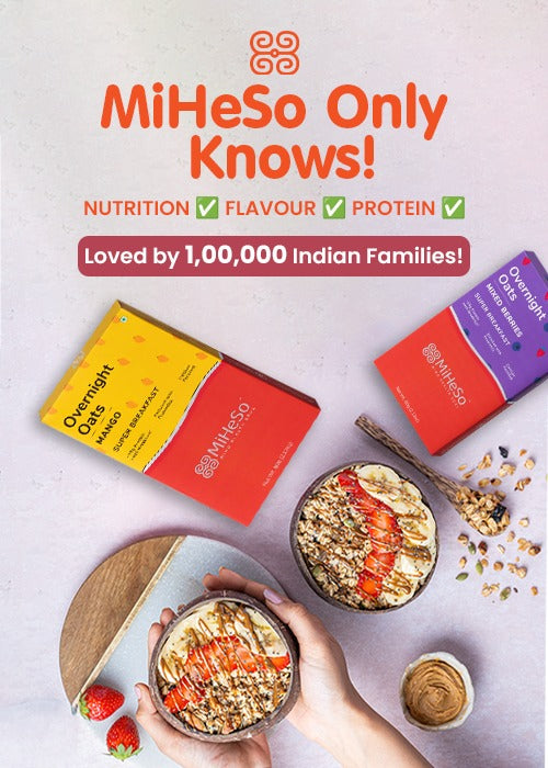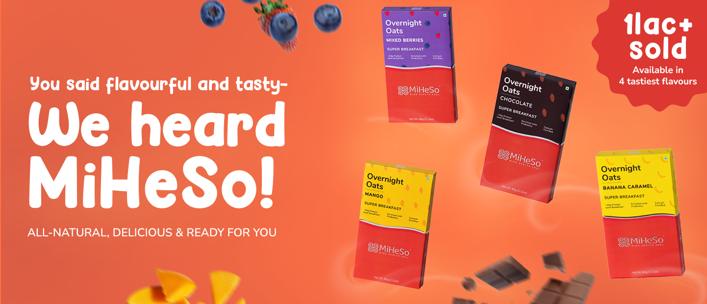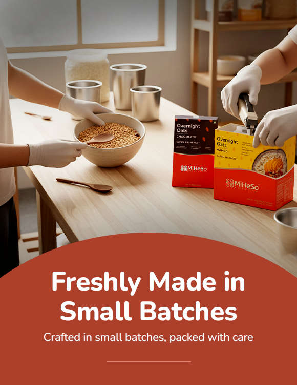Our Overnight flavoured oats already contain all the ingredients you need to make it from scratch. It contains rolled oats, jaggery, almonds, raisins, flax seed, chia seed, pumpkin seed, basil seed, natural fruit powders and probiotics. Since we have already added these, it saves you the hassle of gathering all the ingredients. Just cut open a MiHeSo Overnight Oats pack, add milk and refrigerate. That’s it. Your breakfast is sorted for the next morning.