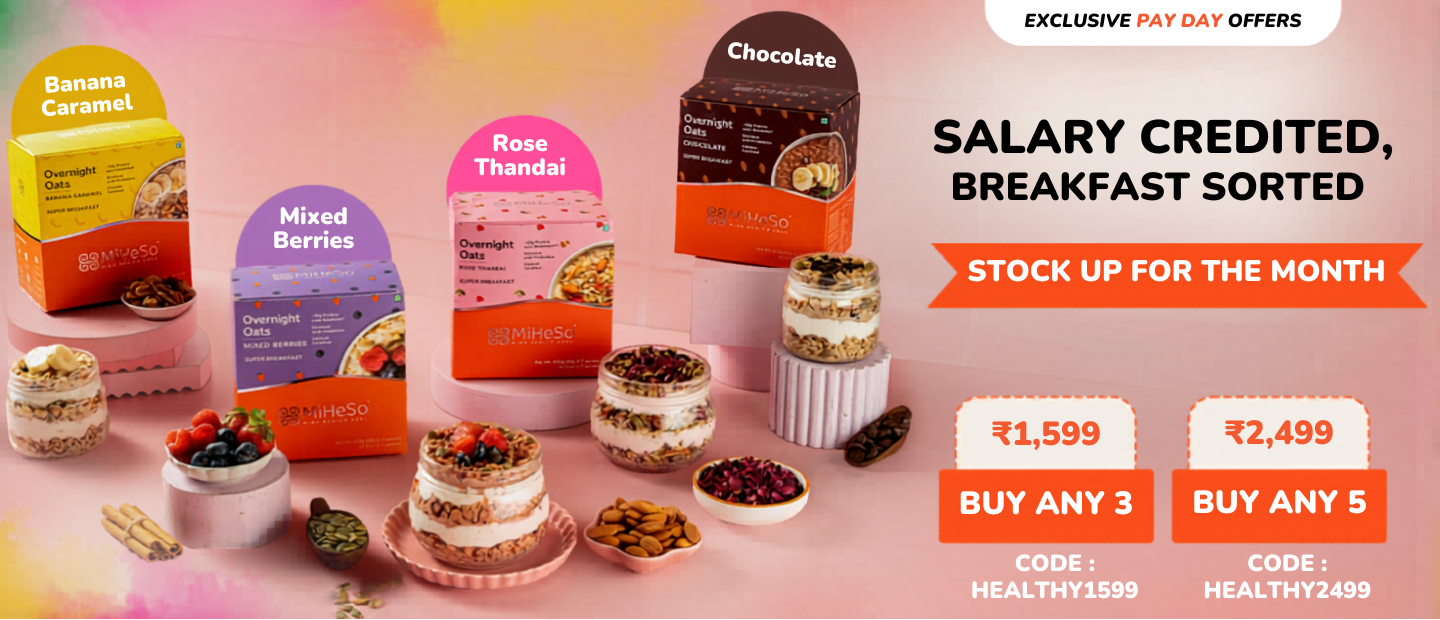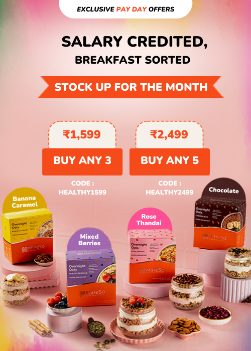 Our Overnight flavoured oats already contain all the ingredients you need to make it from scratch. It contains rolled oats, jaggery, almonds, raisins, flax seed, chia seed, pumpkin seed, basil seed, natural fruit powders and probiotics. Since we have already added these, it saves you the hassle of gathering all the ingredients. Just cut open a MiHeSo Overnight Oats pack, add milk and refrigerate. That’s it. Your breakfast is sorted for the next morning.
