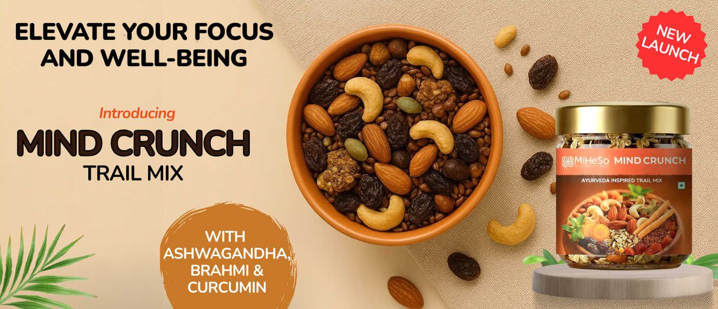 Mind Crunch is a premium nut–seed–fruit trail mix inspired by Ayurveda. Along with nutrient-dense almonds, cashews, seeds, it’s infused with traditional botanicals like Brahmi (Bacopa) and Ashwagandha - known in Ayurveda for cognitive support and stress balance. That’s what sets it apart from regular trail mixes that are just nuts and raisins.