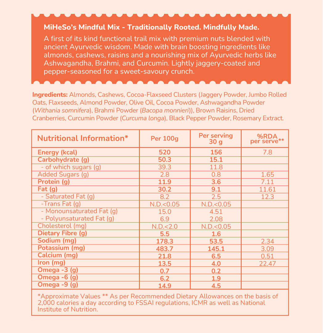 Introducing India's first Ayurveda inspired range of Trail mix. Made with brain boosting ingredients like almonds, cashews, raisins and nourishing mix of Ayurvedic herbs like Ahwagandha, Brahmi and curcumin.